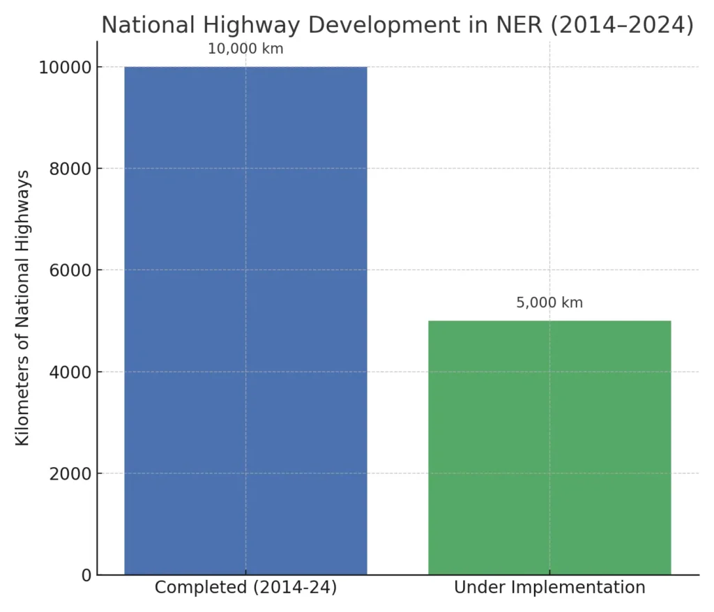 The government’s infrastructure push is the single biggest driver. Between 2014–2024, the NER saw the construction of nearly 10,000 km of National Highways at a cost of ₹1.07 lakh crore, with 5,000 km more under implementation.